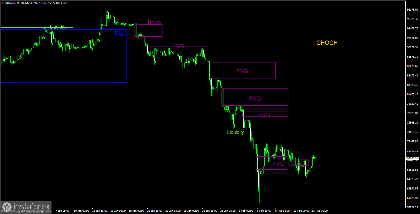 На дневном ТФ биткоин продолжает формирование нисходящей тенденции. Структура тренда идентифицируется, как нисходящая, а линия CHOCH в данное время проходит на уровне 97 900$. Только выше этого уровня можно будет считать, что нисходящий тренд завершен. Напомним, что сигнал на продажу был сформирован внутри «медвежьего» FVG(96 900$ 98 000$) и получил подтверждение на младшем ТФ. Таким образом, трейдеры имели прекрасную возможность забрать практически все последнее движение вниз. Текущей целью остается уровень 57 500$ – 61,8% по Фибоначчи. Так как признаков разворота нет, мы считаем, что падение будет продолжено. На дневном ТФ ближайшая область POI для новых сделок на продажу находится в диапазоне 79 500$ – 81 100$, но до нее биткоину еще нужно добраться.