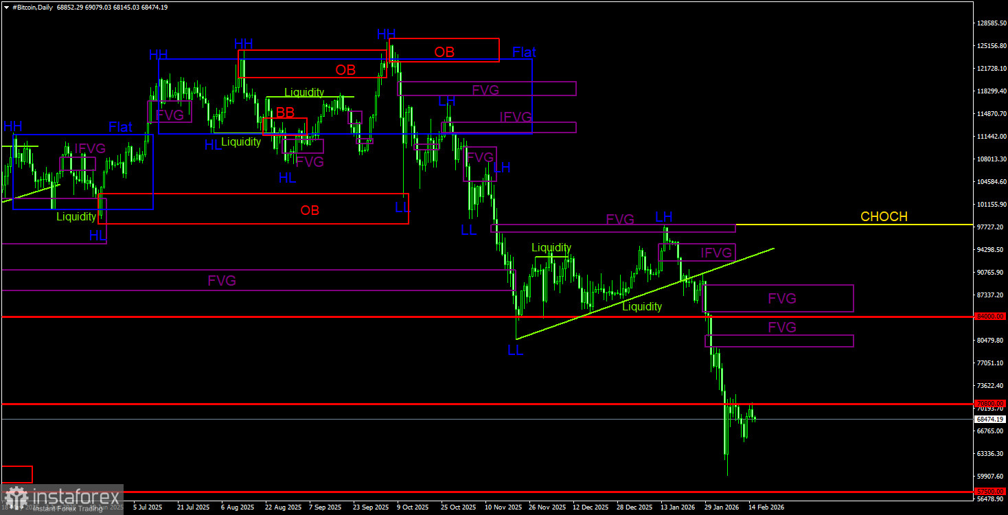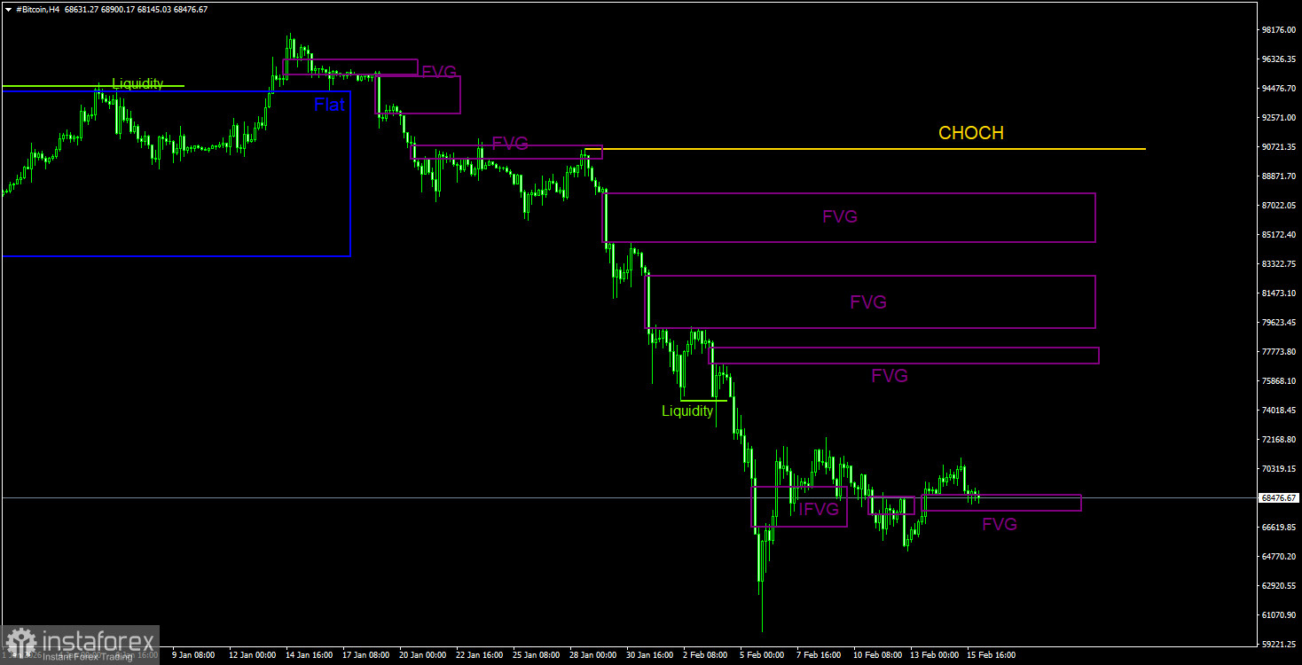 На дневном ТФ биткоин продолжает формирование нисходящей тенденции. Структура тренда идентифицируется, как нисходящая, а линия CHOCH в данное время проходит на уровне 97 900$. Только выше этого уровня можно будет считать, что нисходящий тренд завершен. Напомним, что сигнал на продажу был сформирован внутри «медвежьего» FVG(96 900$ – 98 000$) и получил подтверждение на младшем ТФ. Таким образом, трейдеры имели прекрасную возможность забрать практически все последнее движение вниз. Текущей целью остается уровень 57 500$ – 61,8% по Фибоначчи. Так как признаков разворота нет, мы считаем, что падение будет продолжено. На дневном ТФ ближайшая область POI для новых сделок на продажу находится в диапазоне 79 500$ – 81 100$, но до нее биткоину еще нужно добраться.