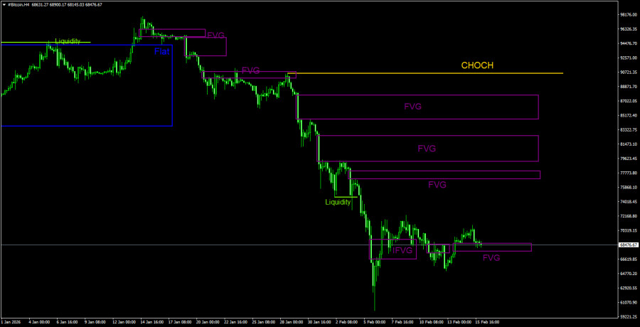 Биткоин в последние 10 дней сумел восстановиться примерно на 10 000$. Назвать такое движение полноценной коррекцией не получается. «Цифровое золото» сейчас находится гораздо ближе к тому, чтобы возобновить падение, чем начать ощутимую коррекцию. Единственный паттерн, который теоретически мог поддержать коррекционное движение – это «бычий» IFVG на 4-часовом ТФ. Не поддержал. В субботу был сформирован новый «бычий» FVG, который имеет шансы поддержать рост биткоина, но уже сейчас заметно, что реакции на этот паттерн нет. Мы склоняемся либо ко флэту, либо к возобновлению обвального падения первой криптовалюты.