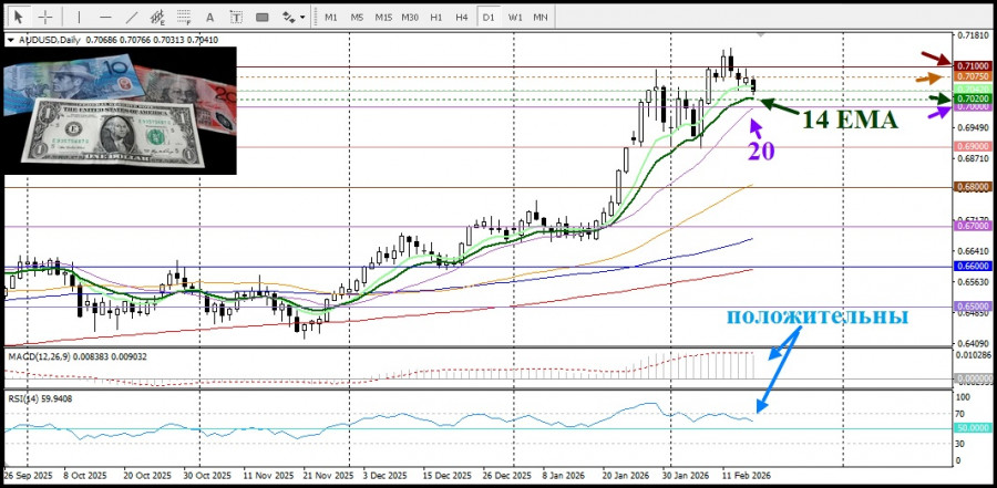 А с технической точки зрения, если пара не удержит 14-дневную ЕМА, то следующей поддержкой станет круглый уровень 0,700, вблизи которого проходит 20-дневная SMA. Не удержав её, быки начнут терять силу. Если ценам, всё же удастся подняться выше 0,7075, то откроется путь к круглому уровню 0,7100. И пока осцилляторы на дневном графике положительны, быки имеют преимущество.