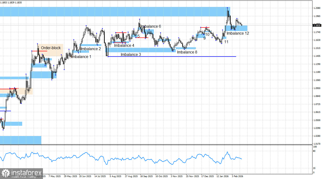 На дневном графике хорошо видно, что практически любой рост за последние 12-13 месяцев был сильнее и резвее любого падения. Например, в период с 24 декабря по 16 января доллар тоже рос, и за этот период времени сумел подняться на 200 пипсов. А в период с 19 января по 27 января рухнул вниз на 450. Таким образом, во-первых, «бычий» имбаланс 12 не инвалидирован. Во-вторых, на графике можно рассмотреть еще один «бычий» имбаланс от 9 февраля, который тоже не инвалидирован. В-третьих, ни одного «медвежьего» паттерна по-прежнему нет. В-четвертых, информационный фон оказывает доллар весьма сомнительную поддержку.