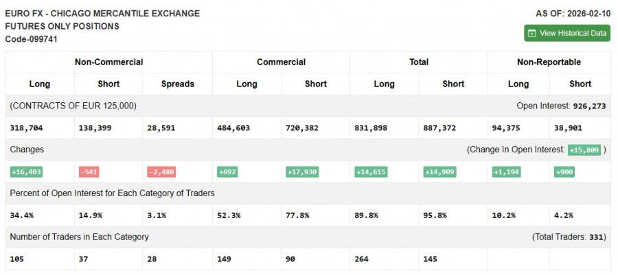 В COT-отчете (Commitment of Traders) за 10 февраля наблюдался резкий рост длинных позиций и сокращение коротких. Очевидно, что более чем правильная политика Европейского центрального банка в отношении процентных ставок позволяет ставить на дальнейшее укрепление европейской валюты в среднесрочной перспективе, чем и пользуются трейдеры. В COT-отчете указано, что длинные некоммерческие позиции выросли на 16 403 до уровня 318 704, в то время как короткие некоммерческие позиции снизились на 541 до уровня 138 399. В результате спрэд между длинными и короткими позициями сократился на 2 480.