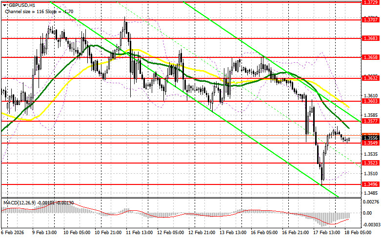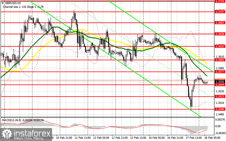 Слабые данные по рынку труда Великобритании вчера привели к падению фунта. Но сегодня давление на пару может снова увеличиться, ведь впереди нас ждут цифры по индексу потребительских цен Великобритании, индексу розничных и индексу закупочных цен производителей. В случае резкого снижения инфляции фунт просядет еще больше. В таком случае первого проявления покупателей ожидаю увидеть лишь в районе поддержки 1.3549, образованной по итогам вчерашнего дня. Лишь формирование там ложного пробоя приведет к хорошей точке входа в длинные позиции с рывком к уровню 1.3577. Прорыв и обратный тест сверху вниз этого диапазона увеличат шансы на укрепление GBP/USD, что приведет к сносу стоп-приказов продавцов и подходящей точке входа в длинные позиции с возможностью выхода к 1.3603, где ожидаю уже более активного проявления медведей. Самой дальней целью будет область 1.3632, где собираюсь фиксировать прибыль. Тест этого уровня остановит развитие медвежьего рынка. При сценарии снижения GBP/USD и отсутствия активности со стороны покупателей на 1.3549, давление на пару снова возрастет, что приведет к движению в район следующей поддержки 1.3523. Лишь формирование там ложного пробоя будет подходящим условием на открытие длинных позиций далее по тренду. Покупать GBP/USD сразу на отскок собираюсь от минимума 1.3496 с целью коррекции в 30-35 пунктов внутри дня.