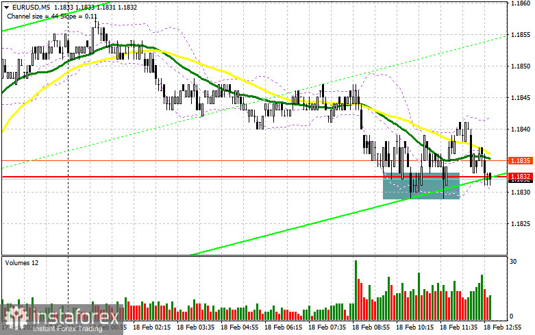 В своем утреннем прогнозе я обращал внимание на уровень 1.1832 и планировал от него принимать решения по входу в рынок. Давайте посмотрим на 5-минутный график и разберемся с тем, что там произошло. Снижение и формирование ложного пробоя в области 1.1832 привели к точке входа на покупку евро, что вылилось в небольшой рост пары на 10 пунктов. На вторую половину дня техническая картина не пересматривалась.