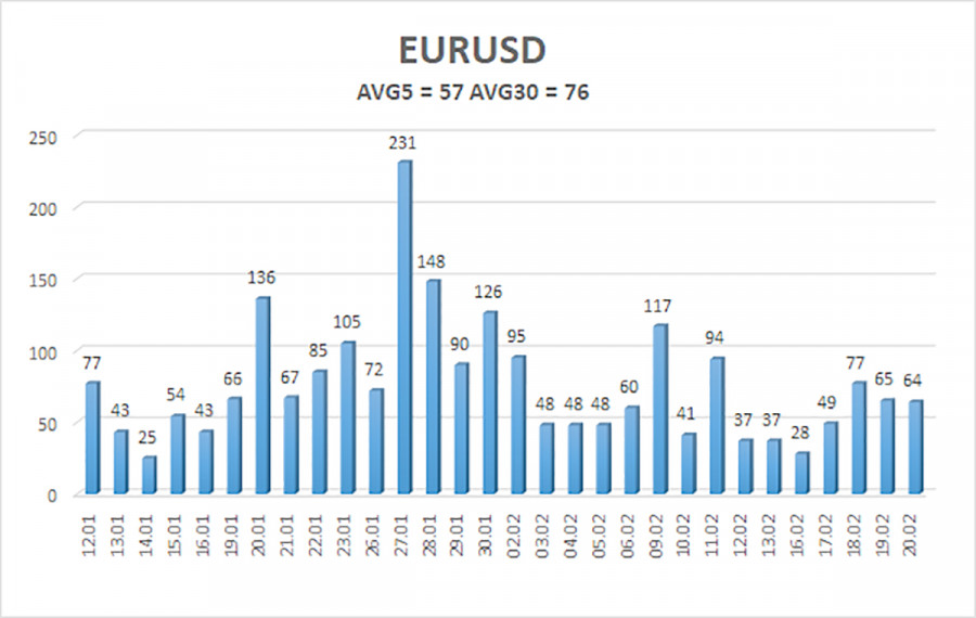 Средняя волатильность валютной пары EUR/USD за последние 5 торговых дней по состоянию на 21 февраля составляет 57 пунктов и характеризуется, как «средняя». Мы ожидаем движение пары между уровнями 1,1728 и 1,1832 в понедельник. Старший канал линейной регрессии направлен вверх, что указывает на дальнейший рост евровалюты. Индикатор CCI заходил в область перепроданности, что предупреждает о возобновлении восходящего тренда.
