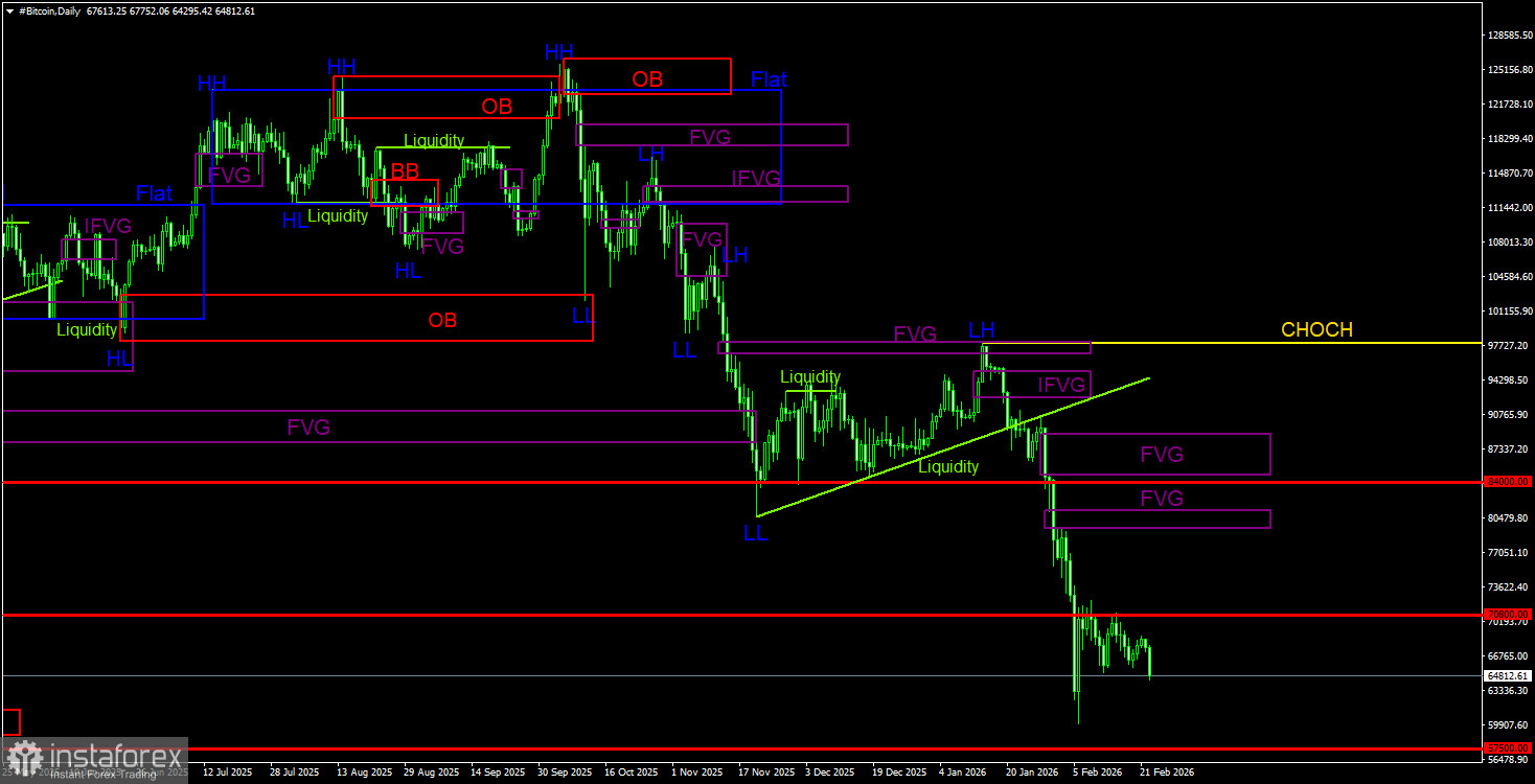 На дневном ТФ биткоин продолжает формирование нисходящей тенденции. Структура тренда идентифицируется, как нисходящая, а линия CHOCH в данное время проходит на уровне 97 900$. Только выше этого уровня можно будет считать, что нисходящий тренд завершен. Напомним, что сигнал на продажу был сформирован внутри «медвежьего» FVG(96 900$ – 98 000$) и получил подтверждение на младшем ТФ. Таким образом, трейдеры имели прекрасную возможность забрать практически все последнее движение вниз. Текущей целью остается уровень 57 500$ – 61,8% по Фибоначчи. Так как признаков разворота нет, мы считаем, что падение будет продолжено. На дневном ТФ ближайшая область POI для новых сделок на продажу находится в диапазоне 79 500$ – 81 100$, но до нее биткоину еще нужно добраться.