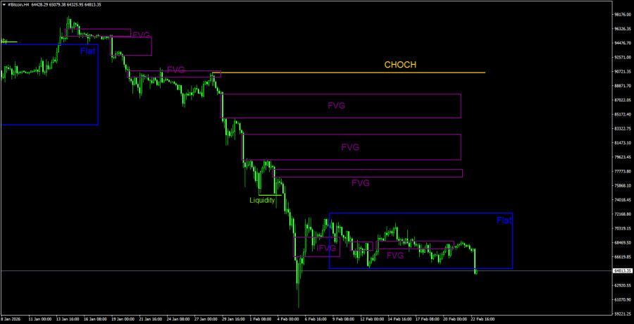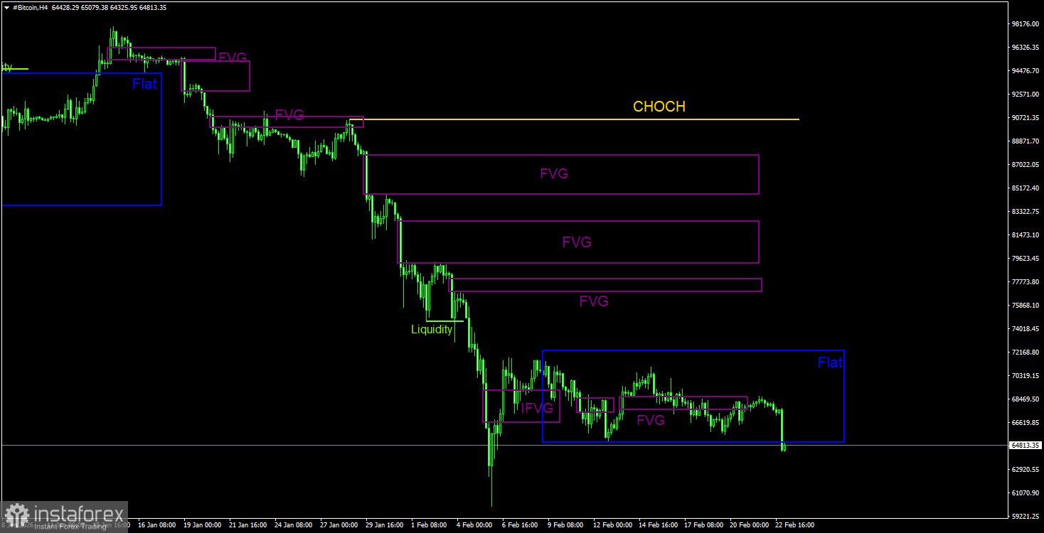 Биткоин продолжает формирование полноценного нисходящего тренда. Мы продолжаем ожидать падения с целью 57 500$(уровень 61,8% по Фибоначчи от трехлетнего восходящего тренда), а признаков разворота тренда в данное время ни одного. Но даже уровень 57 500$ теперь не выглядит, как конечная остановка. Из областей POI на продажу на дневном ТФ можно отметить последний «медвежий» FVG, до которого биткоину еще очень далеко. На 4-часовом ТФ областей POI на продажу нет. Сначала должен быть завершен флэт, а уже затем следует искать возможности для открытия коротких позиций.