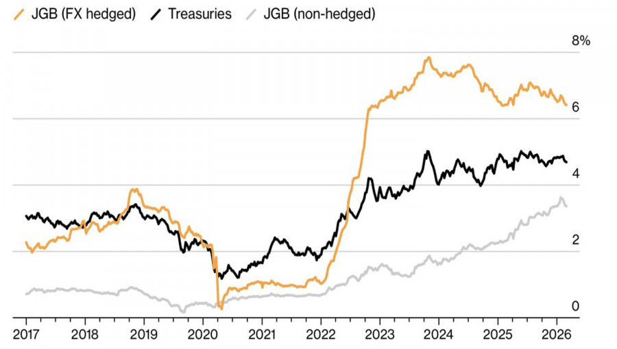 Кадзуо Уэда в своем выступлении перед парламентом был более осторожен. Он утверждает, что в марте и апреле Банк Японии рассмотрит вопрос продолжения цикла монетарной рестрикции. Стоимость заимствований вырастет при условии выполнения прогнозов BoJ. Они предполагают, что инфляция станет на якорь на уровне 2% во второй половине 2026.