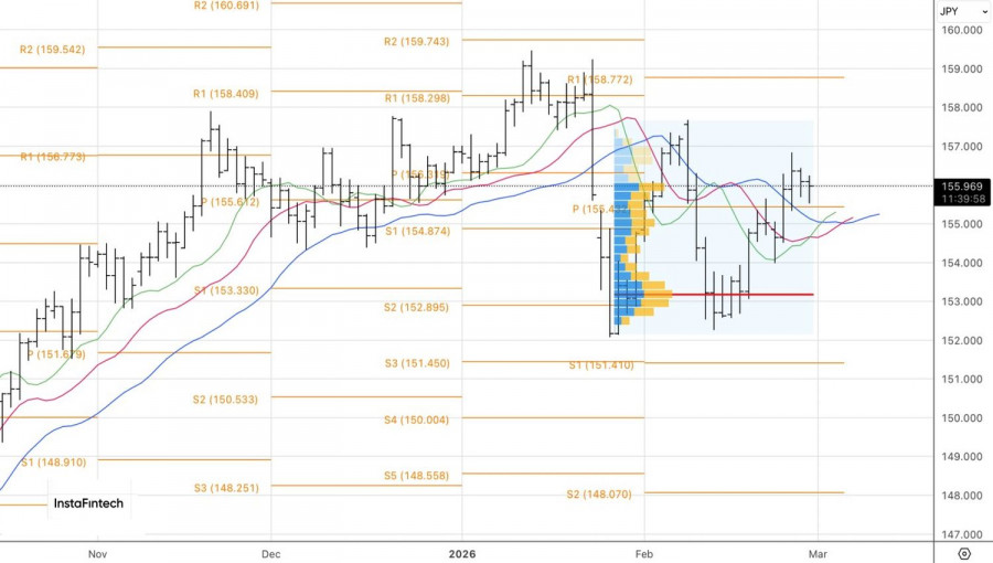 Технически на дневном графике USD/JPY имеет место попытка «медведей» отыграть внутренний бар. Однако его длинная нижняя тень говорит о ловушке со стороны «быков». Прорыв верхней границы бара вблизи 156,4 станет основанием для покупок пары.