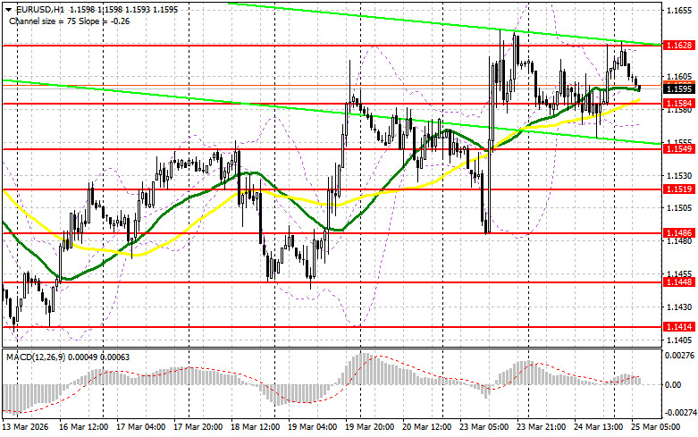С одной стороны новости о том, что через третьих лиц США вроде как на самом деле ведут переговоры с Ираном, оказывают давление на доллар и помогают рисковым активам. С другой стороны, те же новости о том, что США перебрасывают 3000 солдат 82-й воздушно-десантной дивизии на Ближний Восток никак не свидетельствуют о том, что войны может завершиться уже в ближайшее время. Сегодня в первой половине дня ожидаются данные по индикатору условий деловой среды Германии от IFO, индикатору оценки текущей ситуации и индикатору экономических ожиданий Германии. Также состоится выступление президента ЕЦБ Кристин Лагард. Слабые данные, по аналогии со вчерашним днем, снова окажут давление на евро, чем можно будет воспользоваться. Первого проявления покупателей буду ждать в районе новой поддержки 1.1584. Формирование там ложного пробоя даст точку входа в длинные позиции с целью восстановления пары к уровню 1.1628, образованному по итогам сегодняшнего дня. Прорыв и обратный тест этого диапазона станут подтверждением правильных действий на покупку евро уже в расчете на более сильный рывок к сопротивлению 1.1667, где ожидаю активного проявления продавцов. Самой дальней целью выступит максимум 1.1705, где буду фиксировать прибыль. При варианте снижения EUR/USD и отсутствия активности в районе 1.1584, давление на евро сильно возрастет. В таком случае продавцы попытаются дотянуться до следующего интересного уровня 1.1549. Лишь формирование там ложного пробоя будет подходящим условием на покупку евро. Открывать длинные позиции сразу на отскок будут от 1.1519 с целью восходящей коррекции в 30-35 пунктов внутри дня.