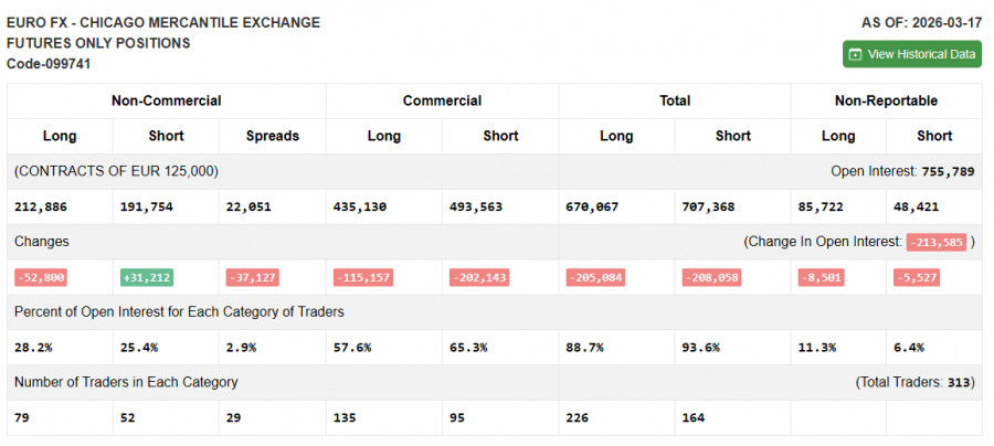 В COT-отчете (Commitment of Traders) за 17 марта наблюдалось сокращение длинных позиций и рост коротких. Учитывая продолжающуюся войну США и Израиля с Ираном, нет ничего удивительно, что в этом отчете вновь зафиксирован резкий рост коротких позиций по евро. Однако после последнего заседания ЕЦБ все будет не так очевидно, как раньше, так что ситуация с продажами может прейти в норму. В COT-отчете указано, что длинные некоммерческие позиции снизились на 52 800 до уровня 212 886, в то время как короткие некоммерческие позиции выросли на 31 212 до уровня 191 754. В результате спрэд между длинными и короткими позициями сократился на 31 127.