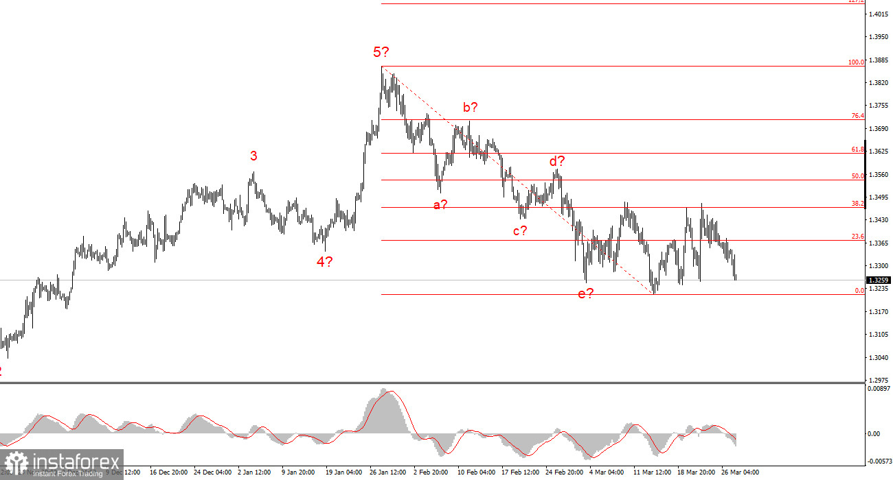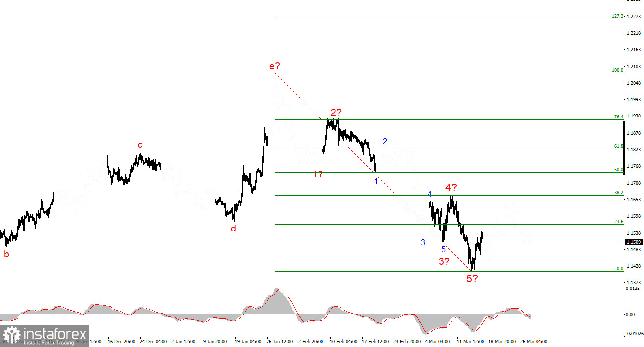 Волновая картина инструмента GBP/USD приобрела очень сложный, нечитаемый вид. Теперь мы видим на графиках семиволновую понижательную структуру, которая, безусловно, таковой не является. Вероятнее всего, внутри одной из волн присутствует удлинение или усложнение. Однако понятнее от этого волновая разметка не становится. Если волновая картина один раз усложнилась до нечитаемого вида, то может усложниться и еще несколько раз. Поэтому я считаю, что сейчас нужно опираться на волновую разметку инструмента EUR/USD, которая выглядит гораздо более понятно. Также не следует забывать о факторе геополитики, который в любой момент может отправить оба инструмента в новое падение. Если этого не произойдет, евро и фунт могут рассчитывать на повышение в рамках коррекции.