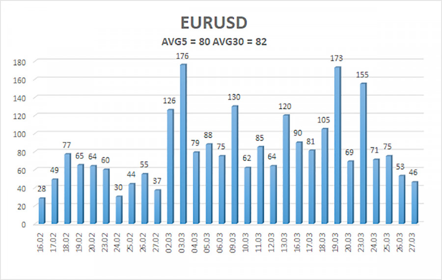 Средняя волатильность валютной пары EUR/USD за последние 5 торговых дней по состоянию на 30 марта составляет 80 пунктов и характеризуется, как «средняя». Мы ожидаем движение пары между уровнями 1,1429 и 1,1589 в понедельник. Старший канал линейной регрессии развернулся вниз, что указывает на смену тренда. Индикатор CCI заходил в область перепроданности и сформировал «бычью» дивергенцию, что в очередной раз предупредило завершении нисходящей тенденции. Но геополитика продолжает тянуть пару на дно.