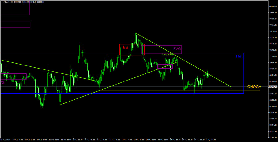 На 4-часовом таймфрейме цена опустилась к нижней границе бокового канала, сформировала девиацию/отскок от нее, а теперь вновь может устремиться вверх. Линия CHOCH, которая является опорой для восходящей коррекции, пролегает на уровне 65 500$, и она не была преодолена. Значит коррекция продолжается. Преодоление этой линии укажет на завершение коррекции, которая длится уже полтора месяца. В ходе последнего витка падения было сформировано два новых «медвежьих» FVG, но если флэт сохраняется, внутренние паттерны не имеют никакого значения. Мы сейчас больше доверяем дневному графику.