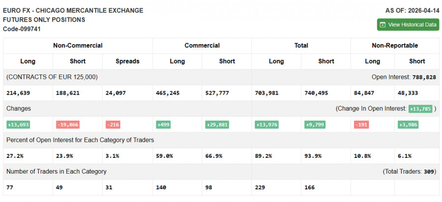 В COT-отчете (Commitment of Traders) за 14 апреля наблюдался рост длинных позиций и сокращение коротких. Очевидно, что двухнедельное прекращение огня на Ближнем Востоке было положительно воспринято трейдерами, что отразилось и на их отношении к рисковым активам. Однако до полного перемирия дело пока так и не дошло, так что все внимание и дальше будет на втором раунде переговоров между США и Ираном. В COT-отчете указано, что длинные некоммерческие позиции выросли на 13 693 до уровня 214 639, в то время как короткие некоммерческие позиции сократились на 19 866 до уровня 188 621. В результате спрэд между длинными и короткими позициями упал на 216.