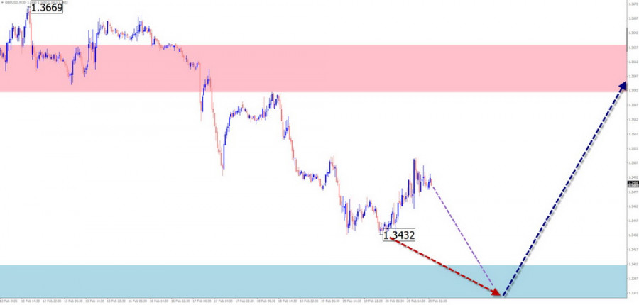 GBP/USDPhân tích:Trên biểu đồ đồng bảng Anh, xu hướng ngắn hạn kể từ cuối tháng 1 năm nay đang được dẫn dắt bởi một nhịp giảm với tiềm năng đảo chiều. Đoạn sóng giữa (B) hiện đang trong quá trình hình thành và vẫn chưa hoàn tất tại thời điểm phân tích. Giá đang tiến gần đến ranh giới trên của vùng tiềm năng đảo chiều mạnh.Dự báo:Đầu tuần tới, dự kiến tâm lý giảm giá tiếp tục chiếm ưu